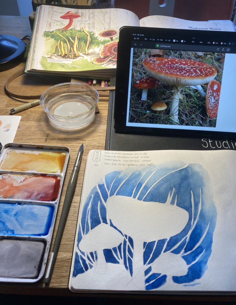 Terug in het centrum pak ik een paddenstoelen-boek uit de kast: ik wil graag meer weten over deze iconische zwam. Ik lees dat vliegenzwammen graag een plekje onder berkenbomen zoeken – en ook onder eiken, kastanjes, beuken en soms dennen – om een symbiotische relatie met deze bomen aan te gaan. Het ondergrondse schimmel-netwerk van de zwam voedt de wortels van deze bomen met mineralen en waters. In ruil geeft de boom de vliegenzwam er suikers voor terug (aangemaakt door het bladgroen uit de bladeren). Een mooie win-win-situatie! Thuis pak ik mijn natuurdagboek en maak aantekeningen en schetsen. Later maak ik er een aquarel bij. Wat een geslaagde paddenstoelen-jacht!