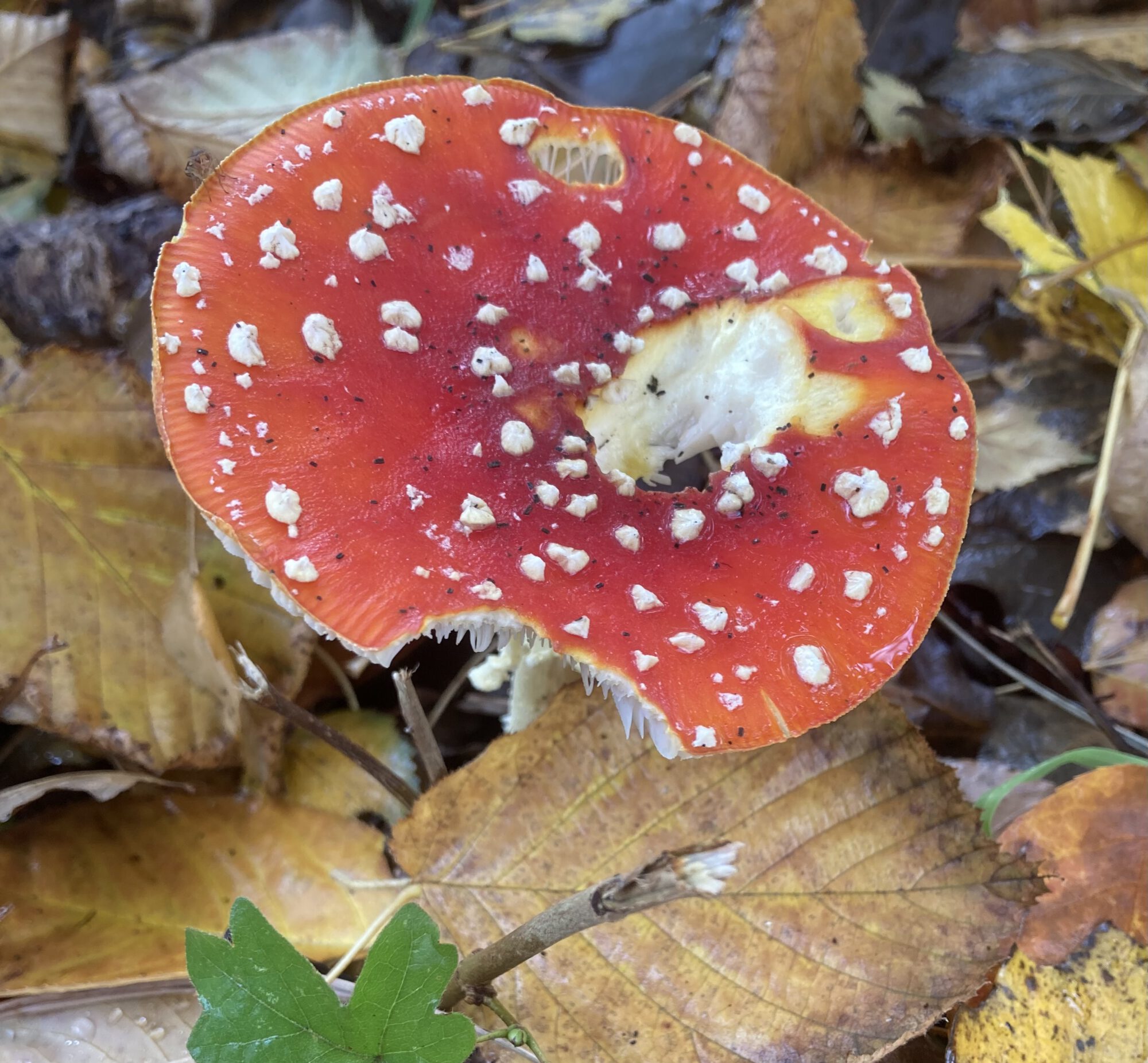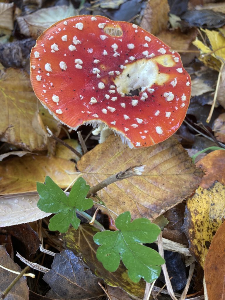 En inderdaad…onder de berk zie ik twee prachtige vliegenzwammen staan. Een grote, diep oranje-rood van kleur en nog bijna helemaal intact (op een klein hapje na). En een kleinere, rode, bolle paddenstoel. Beide zwammen hebben de kenmerkende witte stippen. Ze doen me denken aan kabouters en elfjes uit sprookjes. Ik vraag me af: Welk dier zou een hapje uit de grote paddenstoel genomen hebben? Samen verwonderen we ons over de bijzondere vondst.