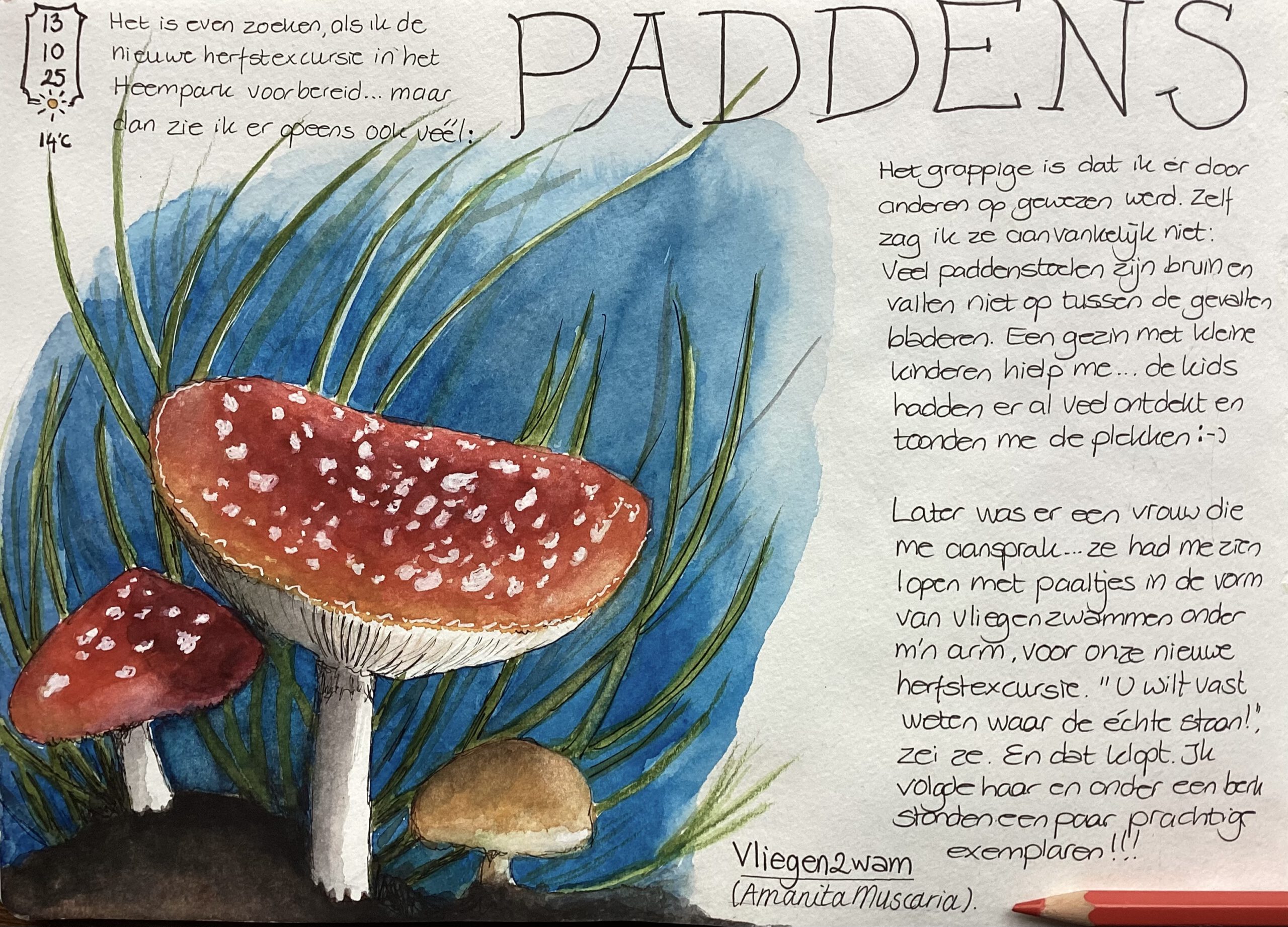 Terug in het centrum pak ik een paddenstoelen-boek uit de kast: ik wil graag meer weten over deze iconische zwam. Ik lees dat vliegenzwammen graag een plekje onder berkenbomen zoeken – en ook onder eiken, kastanjes, beuken en soms dennen – om een symbiotische relatie met deze bomen aan te gaan. Het ondergrondse schimmel-netwerk van de zwam voedt de wortels van deze bomen met mineralen en waters. In ruil geeft de boom de vliegenzwam er suikers voor terug (aangemaakt door het bladgroen uit de bladeren). Een mooie win-win-situatie! Thuis pak ik mijn natuurdagboek en maak aantekeningen en schetsen. Later maak ik er een aquarel bij. Wat een geslaagde paddenstoelen-jacht!