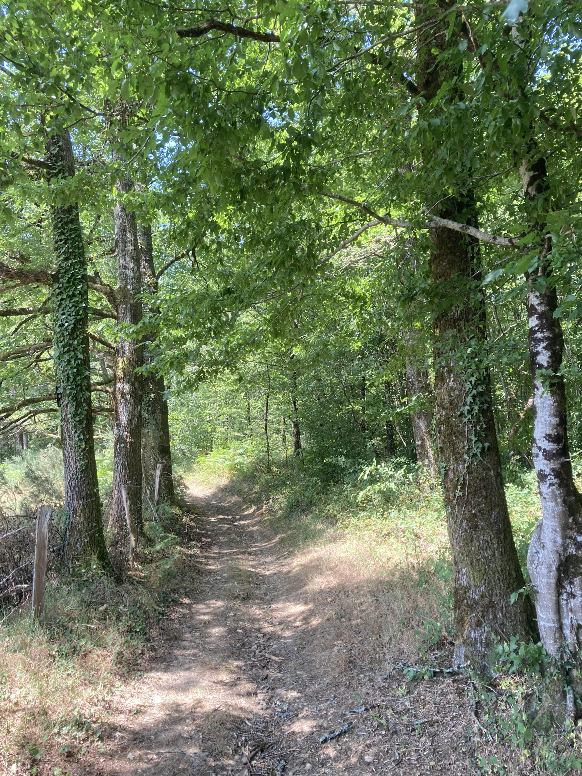Het is heerlijk om weer in actie te kunnen komen: we hebben een groot deel van de dag in de schaduw gezeten met een boek, omdat het echt té warm was om maar iets te doen dat enige lichaamsbeweging vereiste. Het is op dit late tijdstip nog steeds warm, maar de rivier en bomen zorgen voor koelte en het voelt aangenaam. We volgen het pad langs de rivier, waar libelles boven de stenen wegvliegen, en bereiken al snel het eikenbos. Het enige geluid dat we horen – behalve het gekabbel van kleine stroomversnellingen – is het avondlied van haastige vogels op weg naar hun nest.