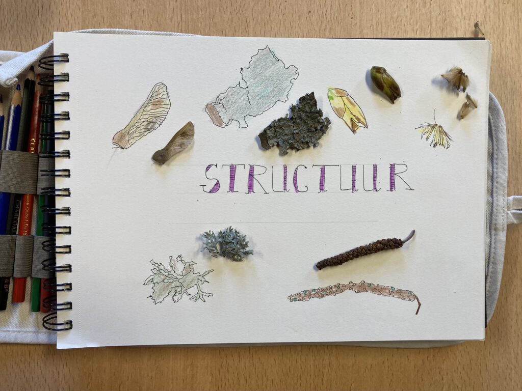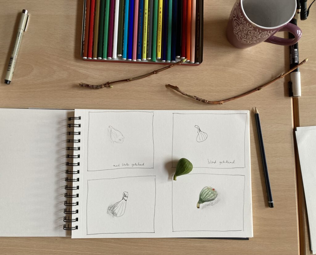 Nu pas pak je je schetsboek erbij. Vind je tekenen (nog) lastig? Begin dan met schrijven! Wat valt je op? Wat vraag je je af? Waar doet het onderwerp je aan denken? Probeer daarna ook wat eenvoudige schetsjes te maken. Leg bijvoorbeeld je blad of bloem op papier en trek de omtrek over. Voeg eventueel wat kleur toe. Blijf goed kijken en houd het eenvoudig.