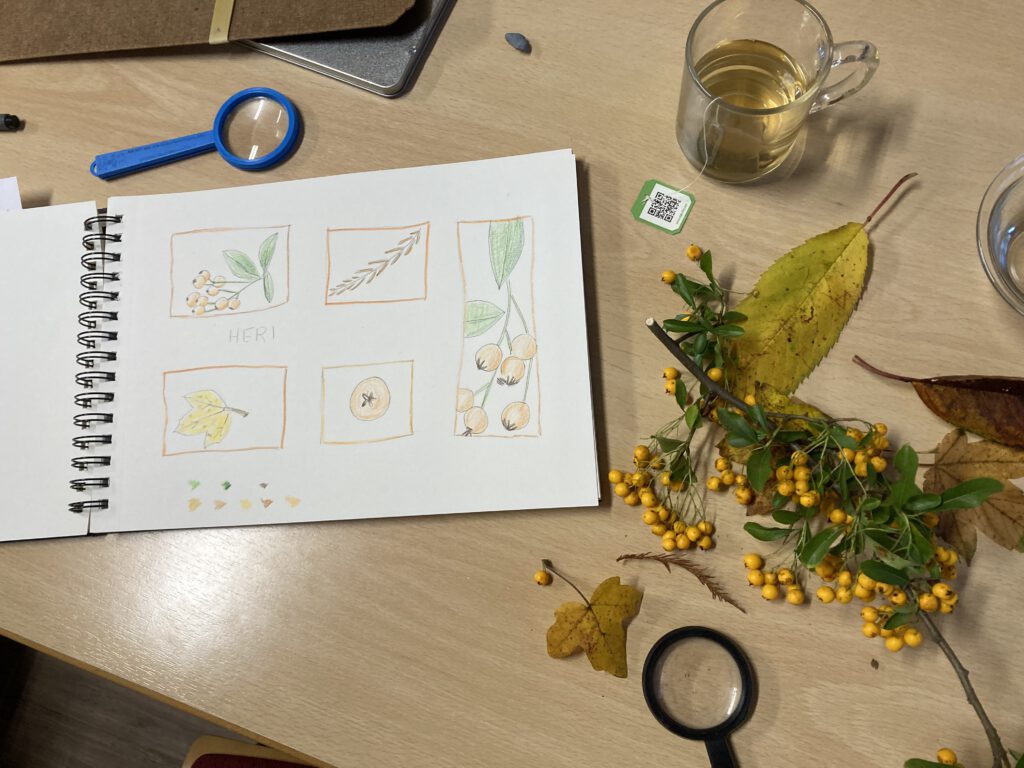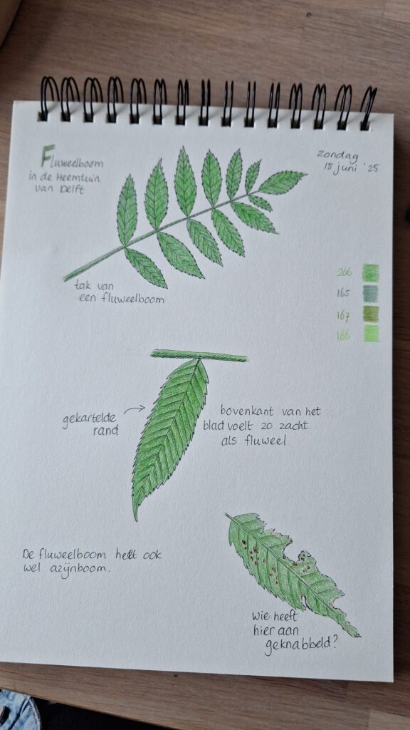 Hieronder zie je een aantal pagina’s gemaakt door deelnemers van onze workshops en cursus Natuurdagboek maken bij De Papaver Delft.