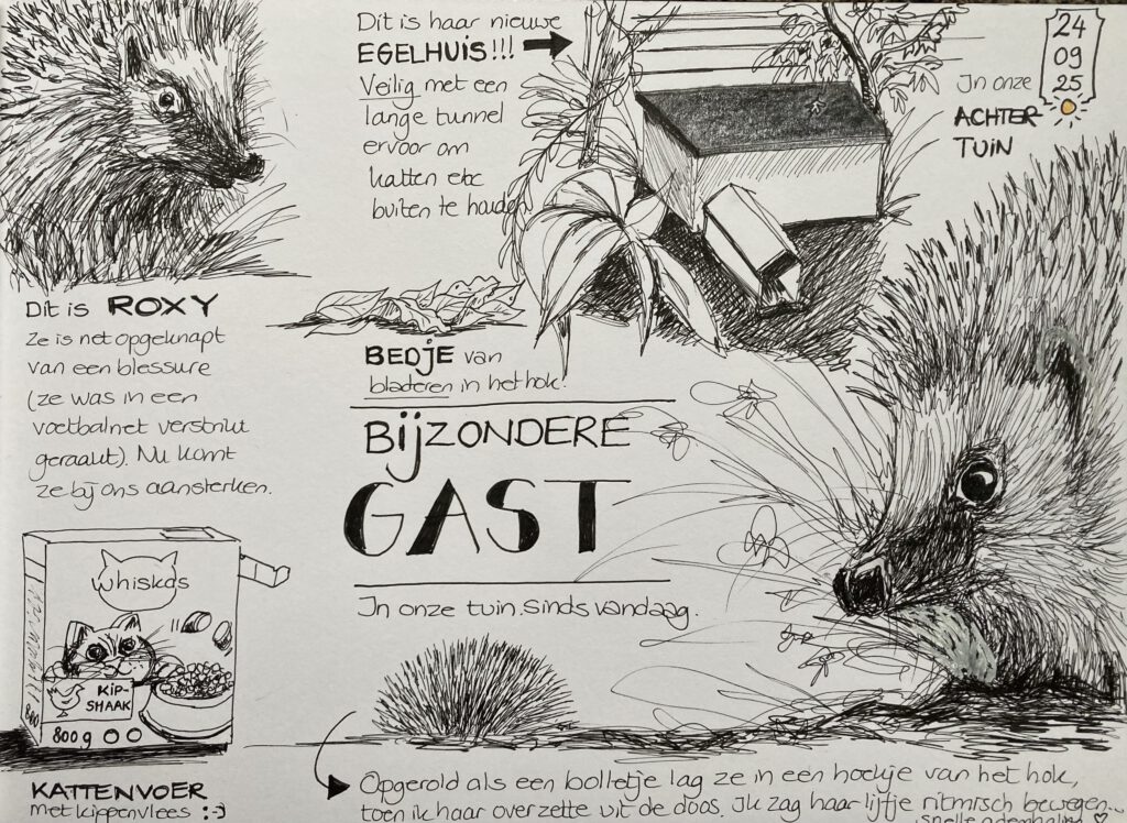De dagen erna blijf ik nieuwsgierig aan Roxy denken als ik de tuin in kijk. We zien haar niet, maar de volgende ochtend zijn er wel brokjes weg uit de voerbak. Ik vul de bak bij en weersta de verleiding om het hok te openen: laat haar eerst maar even rustig wennen in haar nieuwe huis. Egels zijn nachtdieren en slapen wel 18 uur per etmaal, dus het is niet raar dat we haar niet zien. Nog even aansterken met de kattenbrokjes en Roxy zal weer zelf in staat zijn om slakken, spinnen, wormen en misschien zelfs een kleine muis te vinden om zich te voeden. Daar vertrouw ik op. Twee weken later weten we het zeker: Roxy heeft het hok echt betrokken. Ik neem af en toe een kijkje en zie hoe ze ligt te slapen, terwijl ze rustig ademhaalt. Zo mooi!