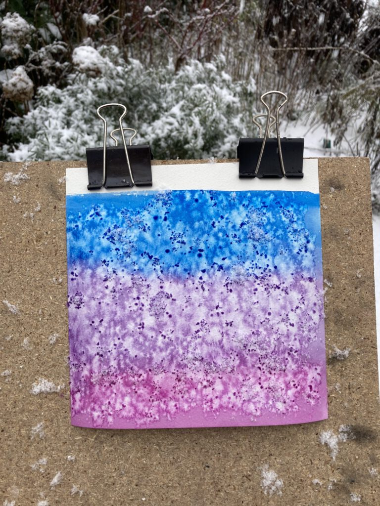 Leuk om te doen als het sneeuwt: bevochtig een vel aquarel en klip het op een plankje. Zet er met royale streken aquarelverf op. Ga ermee naar buiten als de verf nog nat is en laat de sneeuwvlokken erop vallen. Laat je verrassen door de mooie effecten die ontstaan…de sneeuw doet al het werk. Eventueel kun je binnen nog extra verf aan je tekening toevoegen (als de verf nog nat is). Met dank aan Nature Journaler Mirja Brandorff uit Friesland voor het leuke idee.