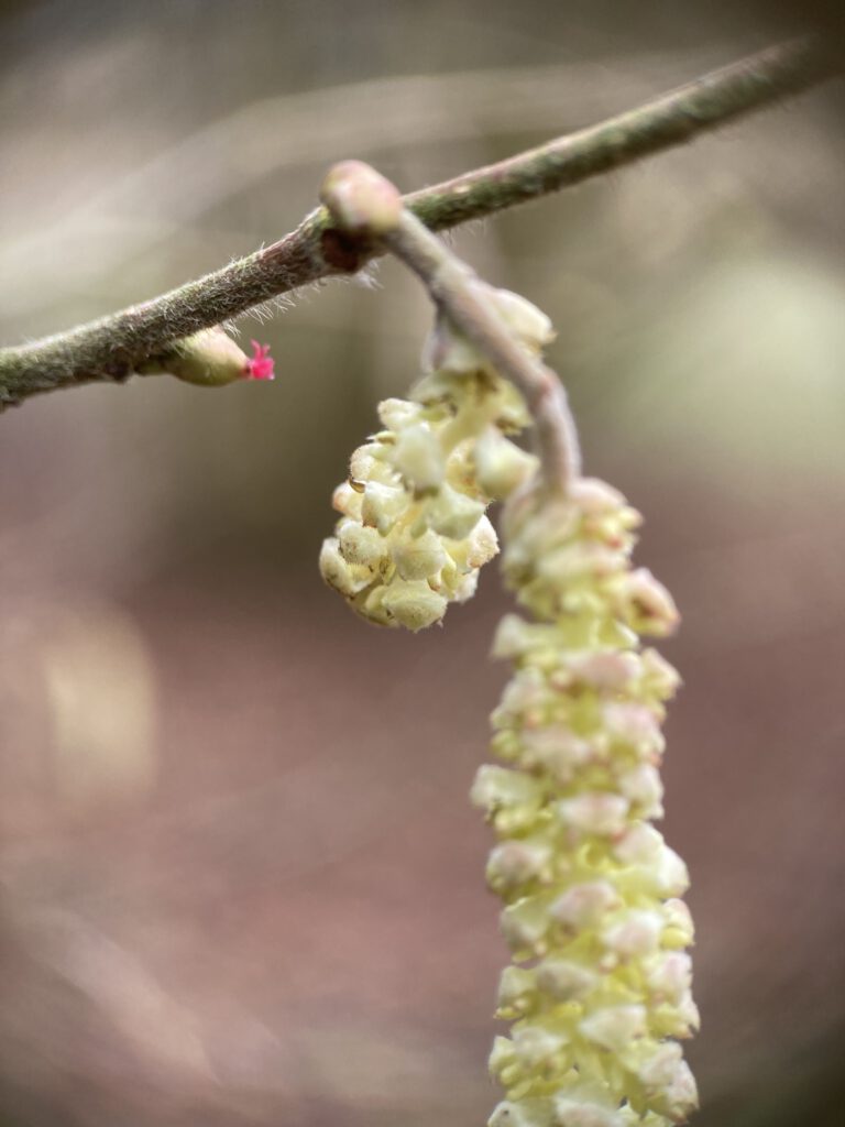 Als het gaat over natuurkennis, ben ik hier in goed gezelschap. Veel van de deelnemers zijn actief als vrijwilliger bij een van de Delftse natuurbeschermingsorganisaties (waaronder ikzelf). Zo hoor ik dat de struik zichzelf kan bevruchten: aan de plant groeien immers zowel mannelijke als vrouwelijke bloeiwijzen. In praktijk hebben ze echter vaak stuifmeel van een andere hazelaar nodig om noten te kunnen vormen. Als ik voortaan vroeg in het jaar voorbij bloeiende hazelaars rijd, zal ik extra letten op die roze bloempjes. Zonder deze minibloempjes geen hazelnoten!