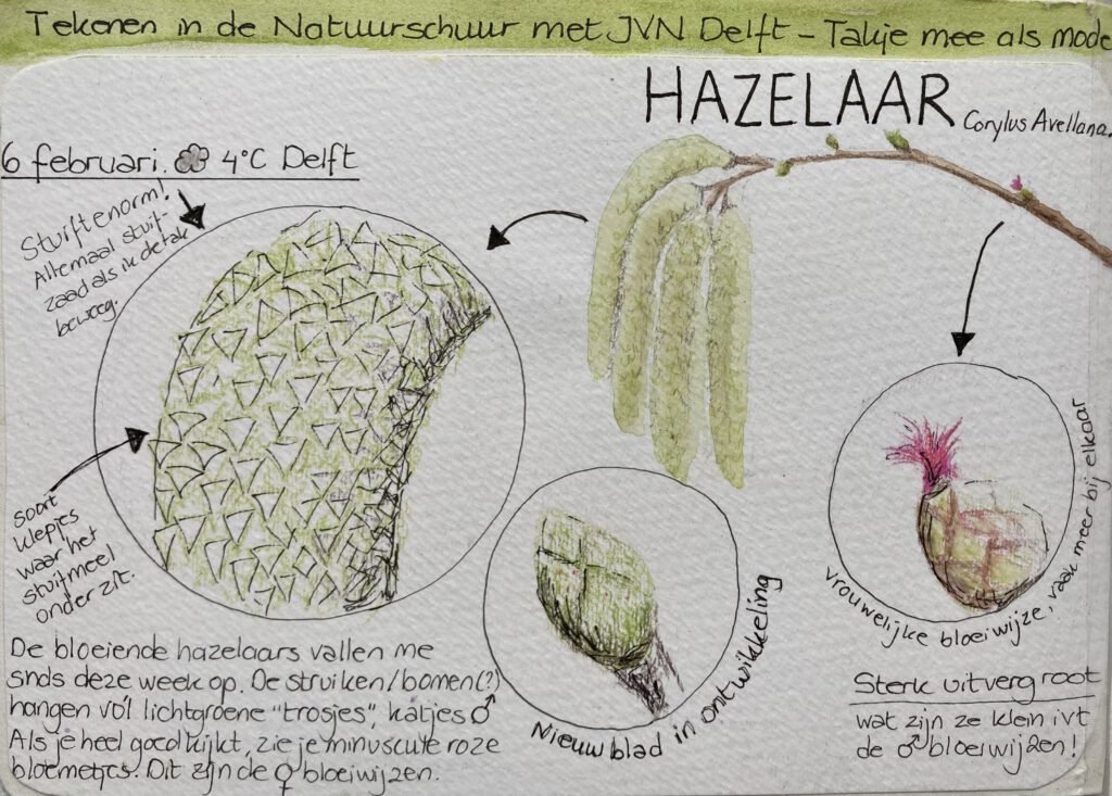 Op weg naar de Delftse Natuurschuur voor de maandelijkse ochtend IVN-natuurtekenen, merk ik dat ik aan de late kant ben. Gehaast stop ik mijn spullen in mijn fietstas; ik zal flink moeten doorfietsen om nog op tijd te komen. Zodra ik het natuurgebied inrijd, vertraag ik echter onwillekeurig. Mijn aandacht wordt getrokken door rijen bloeiende hazelaars, zwaar beladen met geelgroene trosjes. Ik kan het niet laten en stop om ze van dichtbij te bekijken. De eerste lentetekenen!